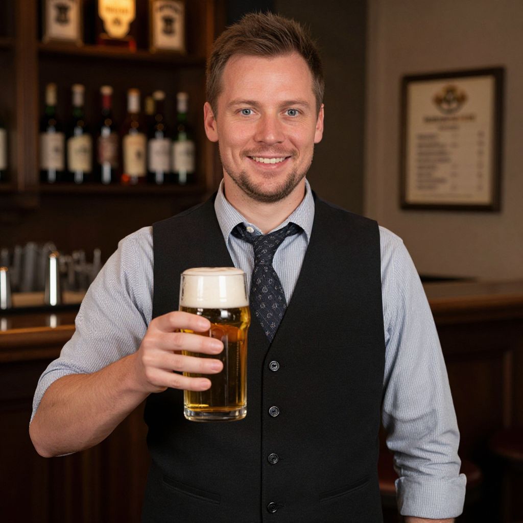 Photograph of a smiling Caucasian man with short brown hair and a light beard, wearing a light blue dress shirt, dark blue tie, and black vest. He holds a glass of amber beer with a foamy head in his right hand. Background features a dark wooden bar with shelves of liquor bottles and a framed certificate on the wall. The lighting is warm, highlighting the man's friendly expression and the beer's golden color. The setting suggests a cozy, well-lit bar or pub.