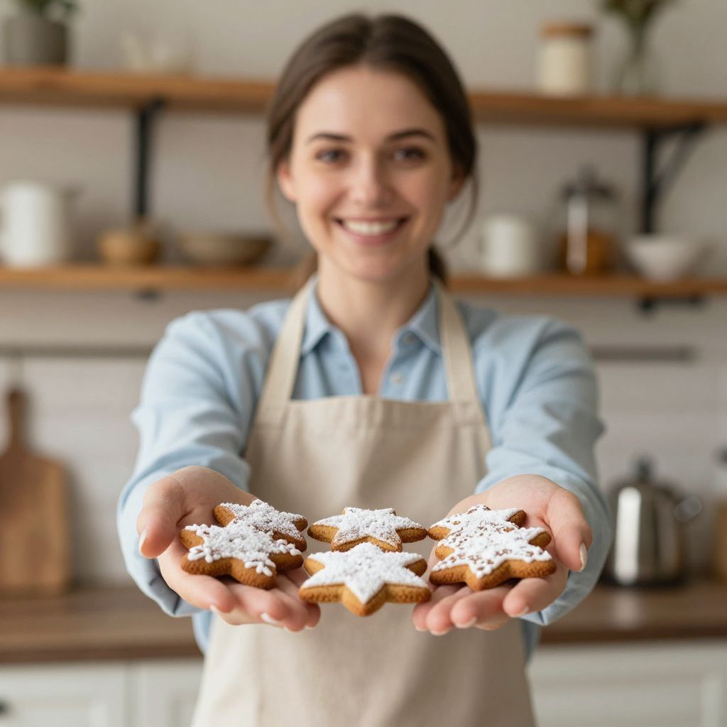 Smiling woman wearing a beige apron and light blue shirt holds five freshly baked, powdered-sugar-dusted gingerbread cookies in her outstretched hands, set against a cozy kitchen backdrop with wooden shelves and warm lighting.