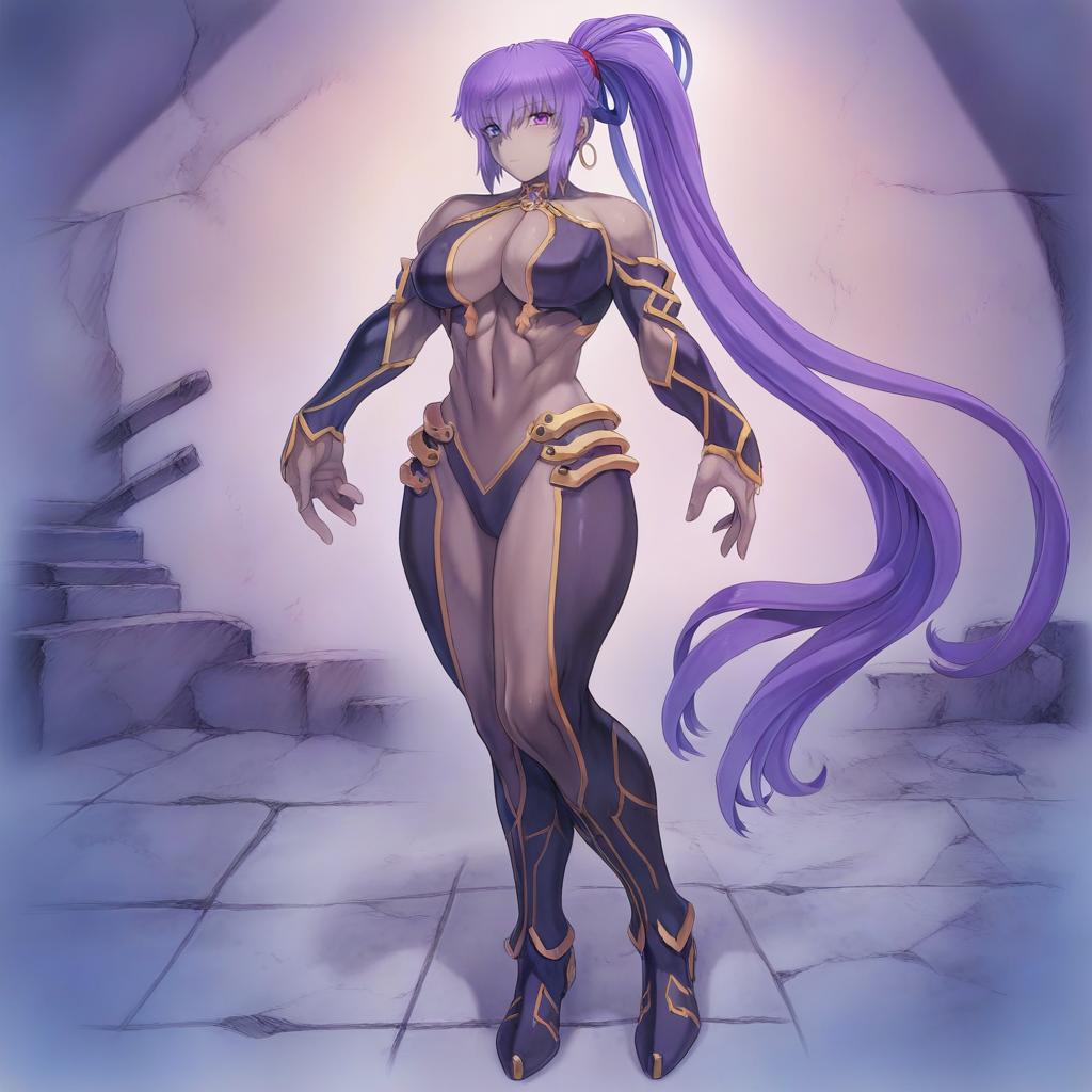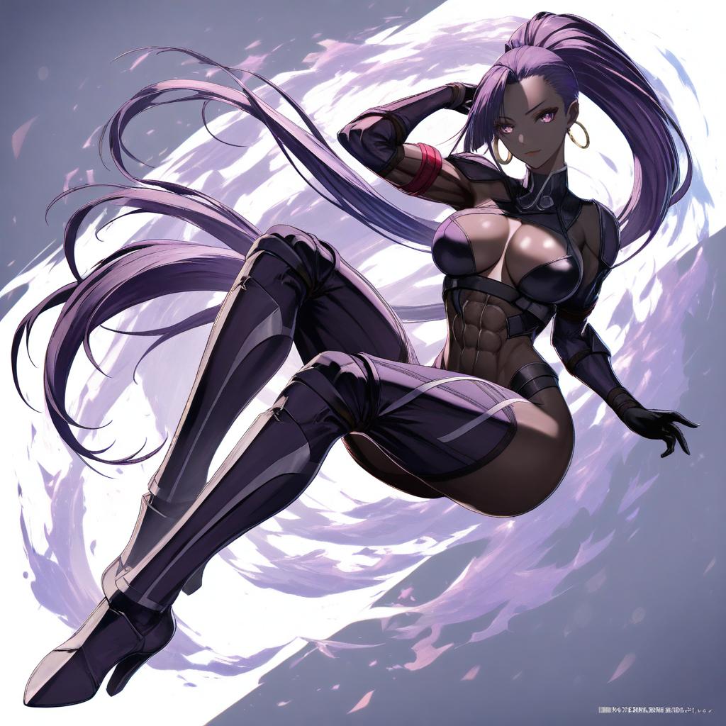 Assassin (fate/zero), fate (series), 1girl, dark-skinned female, grey skin, very dark skin, purple eyes, purple hair, very long hair, long hair, ponytail, medium breasts, hoop earrings, abs, muscular female, by artist mogudan, leet