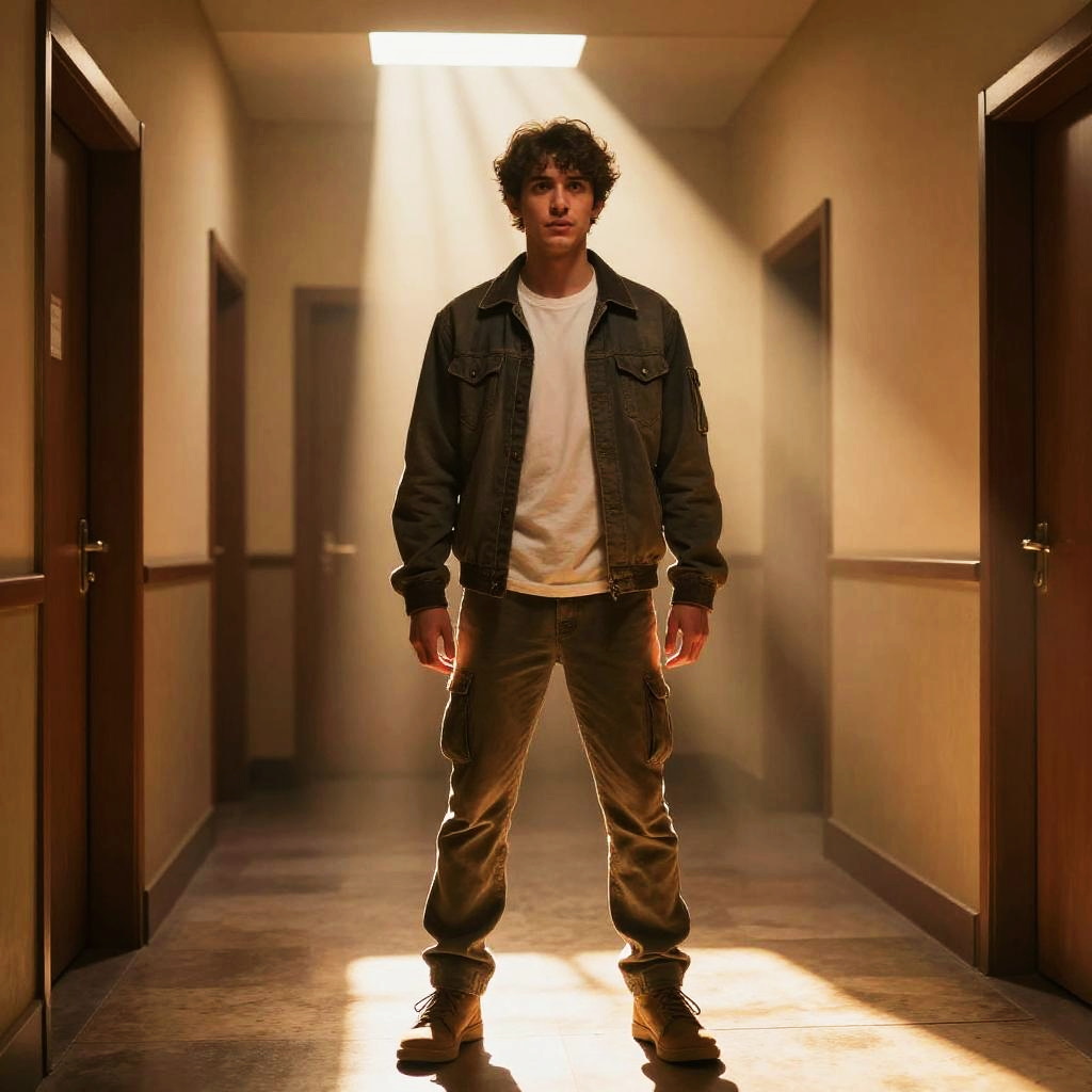 Sulley Costume Adult, man in a jacket and a t - shirt standing in a hallway --sref 1446