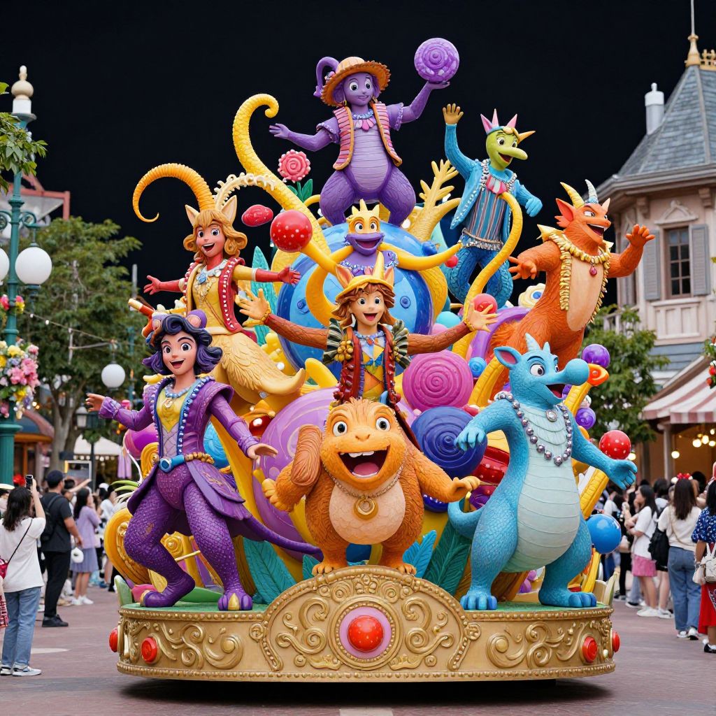 Gisney fantasy parade featuring intricate costumes, magical creatures, lively music, vibrant hues, detailed animation style, festive atmosphere filled with wonders and joy, high contrast, vivid digital painting