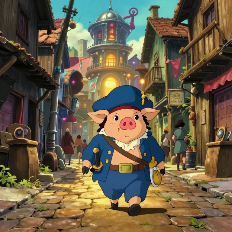 In this vibrant, Miyazaki Studio Ghibli-style anime film illustration, a pig-nosed kobold dressed in pirate attire confidently strides down a sci-fi shanty town alley. The cobblestone path, bathed in warm, golden light, leads the viewer's eye towards a distant, illuminated building. The kobold, adorned with a blue hat, jacket, and pants, carries a sword at his side, exuding an air of adventure. The surrounding buildings, constructed from a mix of wood and metal, exhibit a rustic charm with their weathered facades and various signs and banners. The scene is teeming with life, as figures can be seen moving about in the background, adding depth and dynamism to the composition. The interplay of colors, from the kobold's vibrant attire to the muted tones of the shanty town, creates a visually captivating and immersive atmosphere.