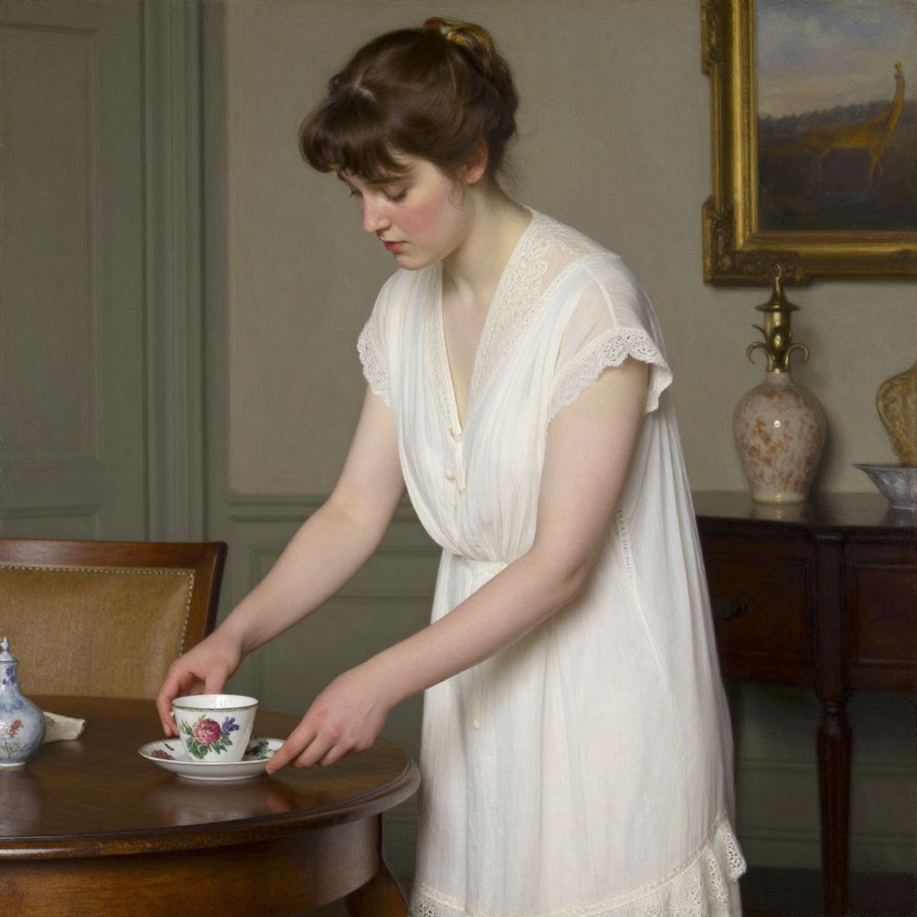A woman in a vintage white gown stands gracefully beside a wooden table, her hands delicately arranging a floral-patterned cup and saucer, captured in a British 30s impressionist style with soft, natural lighting and detailed textures reminiscent of Walter Ernest Webster's figurative oil portraits.