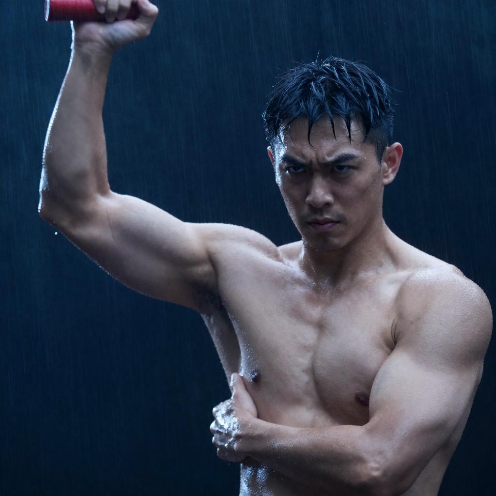Shirtless Asian man with short black hair, muscular build, and defined abs, raises fist towards wooden bucket on rustic fence. Background: bright sunlight, green foliage. Intense expression. One person. Action pose. White pants. Outdoor setting.