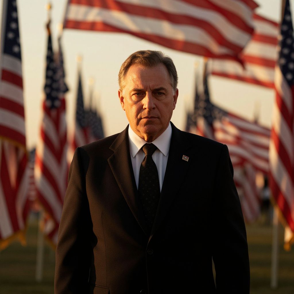 Photograph of an older white man with short, gray hair, wearing a black suit, white shirt, and black tie, standing in front of numerous American flags. The sun casts a strong backlight, creating a dramatic silhouette effect. His expression is serious and determined. The flags in the background are slightly blurred, emphasizing the subject. The man's face is centered, and the image has a high contrast, highlighting the intensity of the scene. The flags' red, white, and blue colors contrast with the dark suit. The lighting and composition evoke a sense of patriotism and solemnity.