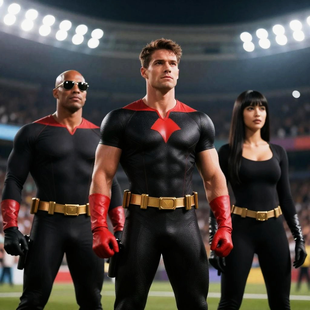 Three superheroes in tight black and red suits with gloves and belts, standing in a stadium under bright lights. Bald man with sunglasses on left, muscular man in center, woman with straight black hair on right. Background: cheering crowd, blurred.