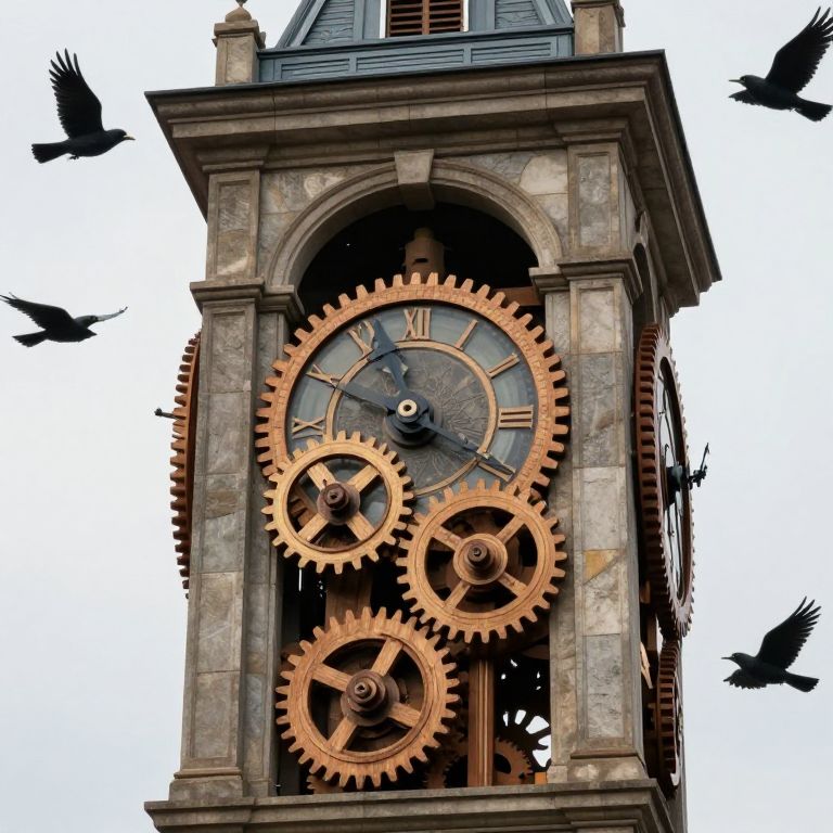 Kinetic clock tower crafted from intricate wooden gears and stone-like structures, surrounded by dark, animated birds in flight, its hands moving backward as if time itself is unraveling.