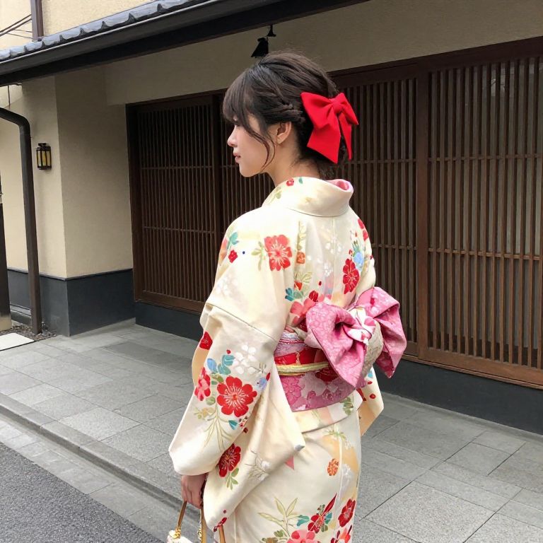 Female in a kimono with a floral pattern and a red bow in her hair. She is standing on a sidewalk in front of a building.