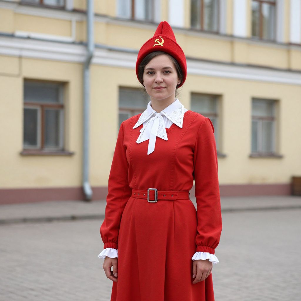 Soviet Union Costume, woman in a red hat and red dress standing in front of a building