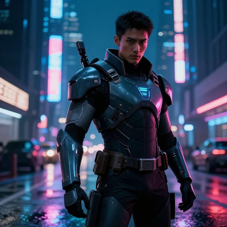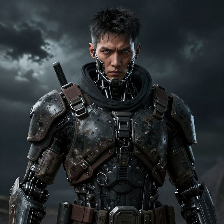 CGI image of a fierce, dark-haired male warrior with cybernetic armor, black scarf, and sword sheath, under a stormy,