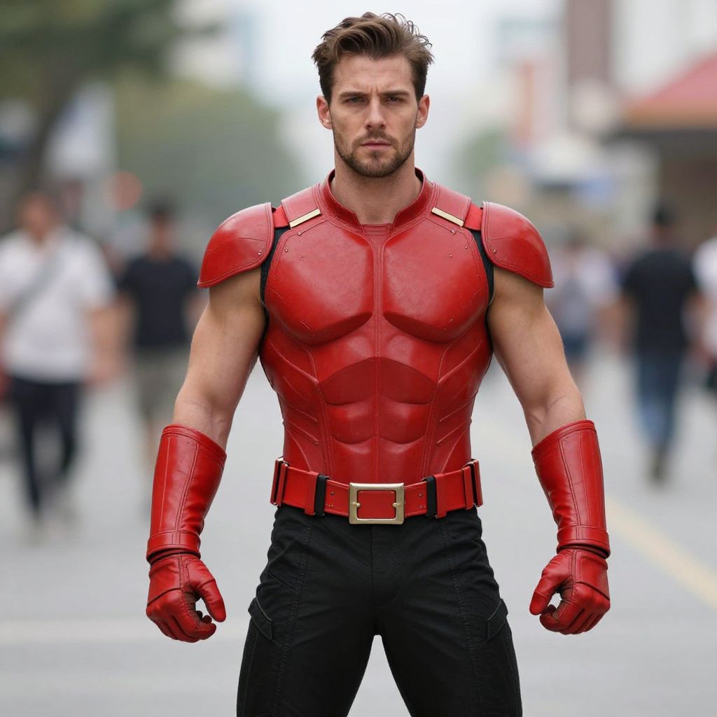 Juggernaut xmen costume, male focus, armor, 1boy, red gloves, gloves, muscular, red armor, outdoors, pants, blurry background, superhero, black pants, short hair, muscular male, belt, facial hair, blurry, standing, brown hair, solo focus, solo