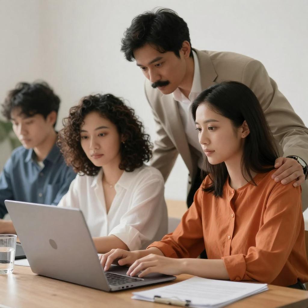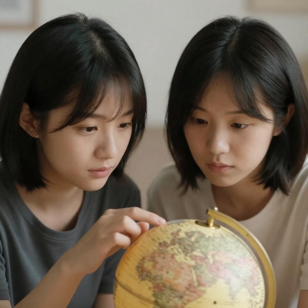 Photograph of three women in a library. Central woman with dark hair, beige top with ruffles, smiles while writing. Woman on left leans over wooden shelf, smiling. Woman on right with light brown hair, pink shirt, stands behind central woman, looking forward. Stacks of books and papers on desk. Warm lighting, wooden shelves in background.