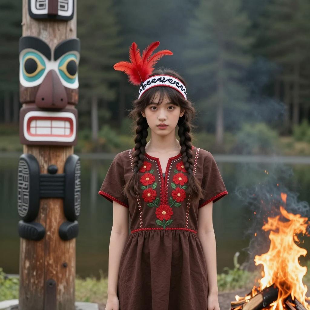 Girl with braided hair, brown dress, red floral embroidery, white headband with black design, stands near wooden totem pole. Fire burns on right. Forested lake background. Bright red feather in headband. Centered, facing camera.