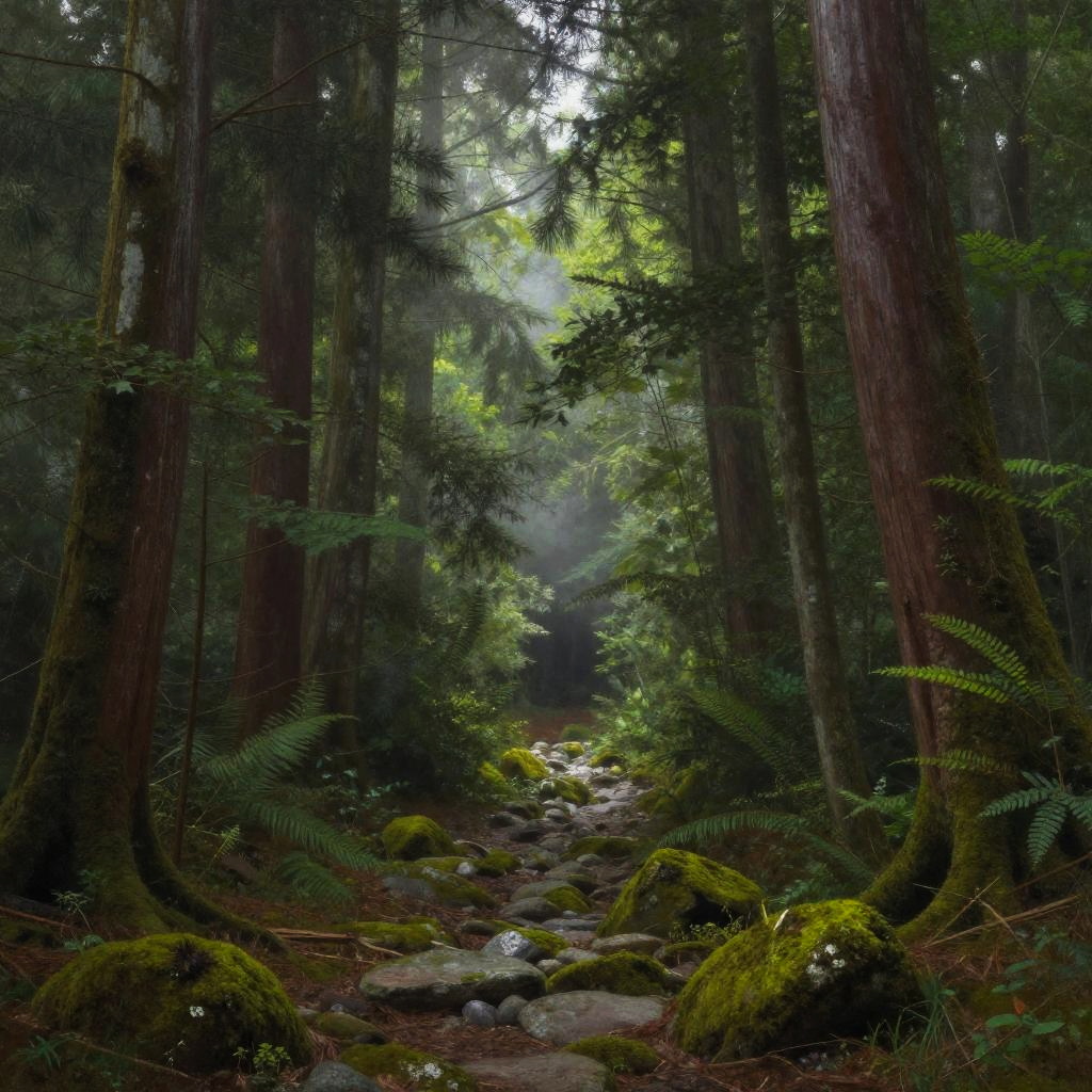 Cerrada dense forest path in early morning mist, tall ancient trees with thick green foliage, soft light filtering through branches, moss-covered stones along the trail, tranquil atmosphere with hints of wildlife sounds, hyper-realistic nature painting style.