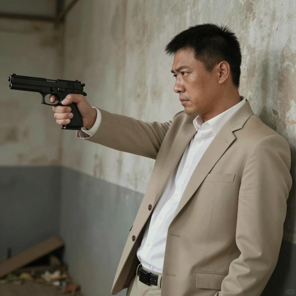 A man with short black hair, light skin, and a serious expression, wearing a beige suit and white shirt, pointing a black handgun forward with his right hand. He is leaning back against a dirty, worn-out wall in a dimly lit, rustic setting. His gaze is focused on the gun. The background includes blurred, brownish ures and debris.