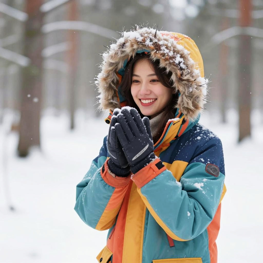 A joyful woman dressed in a colorful winter jacket with a fur-lined hood stands outside in a snowy forest. She is smiling warmly, wearing thick gloves, with snow gently falling around her, creating a cozy winter atmosphere.
