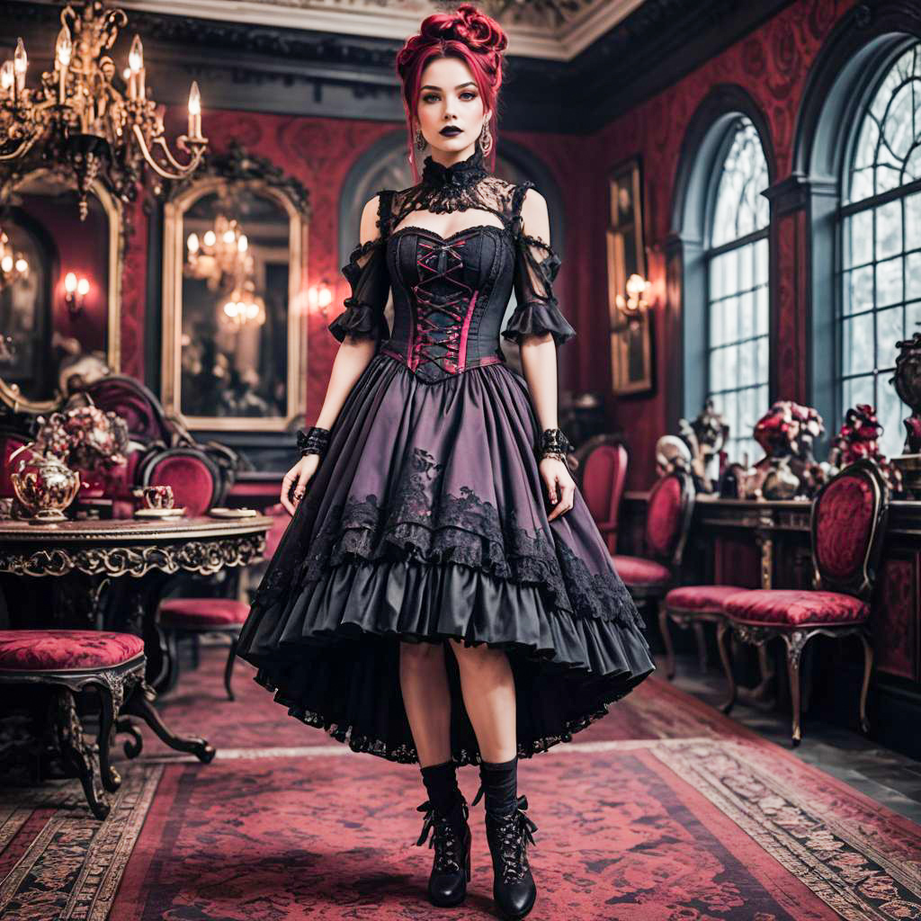 Photo of a S-Shaped woman, Messy Bun, rbd outfit, red and black dress with gothic style, lace details, corset top, Viscose fabric, knee-length with dramatic flair, dark elegance, Tyrian Purple accents, platform shoes, tea room, cinecolor