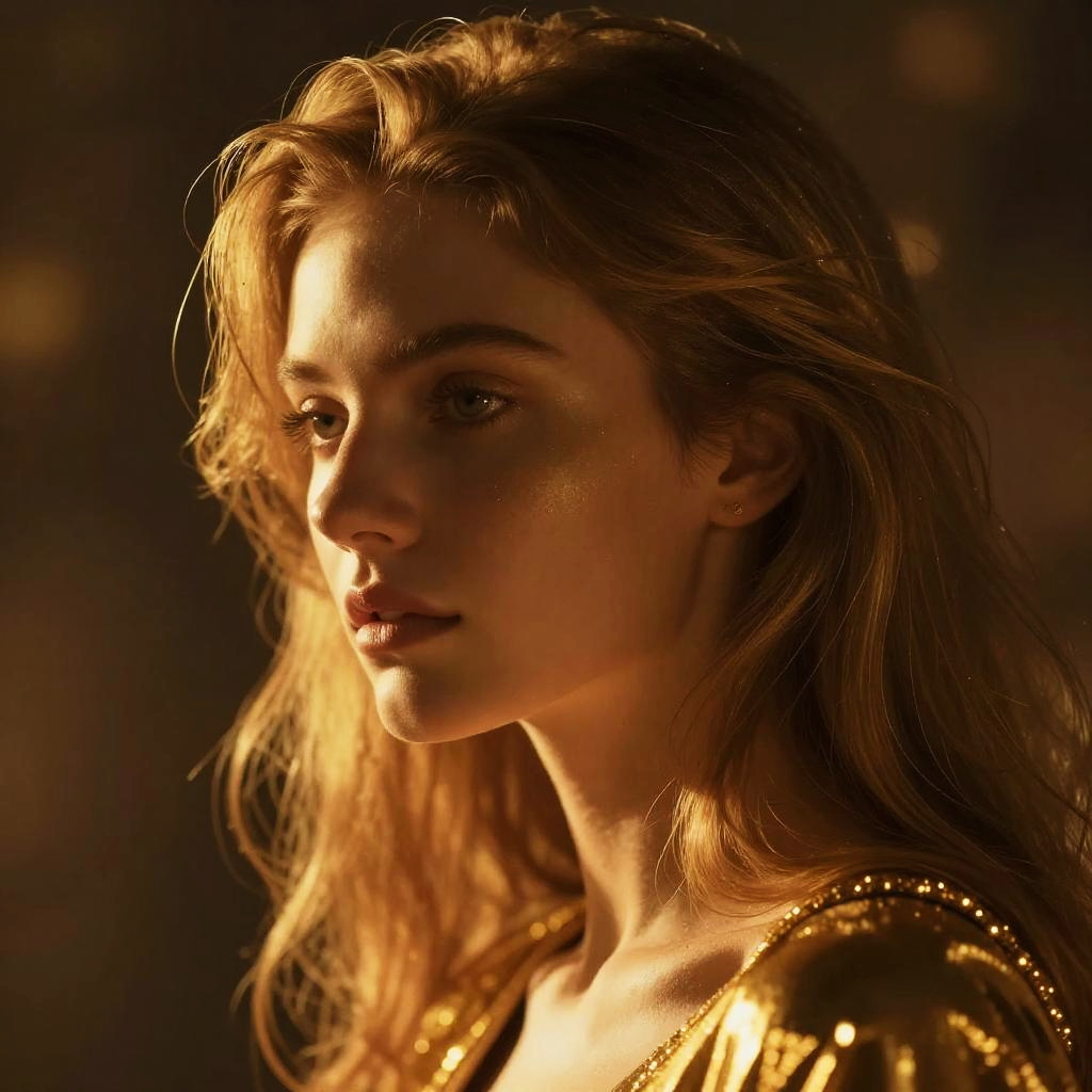 Detailed illustration, curvy, gold, portrait, cinematic lighting, hires, volumetric lighting, masterpiece