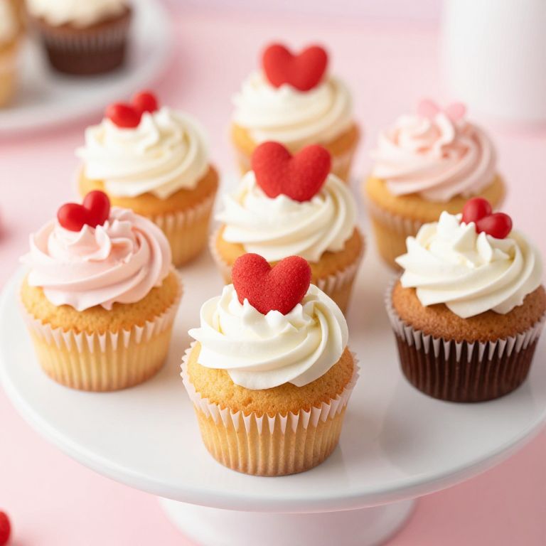 Photograph of seven cupcakes on a white pedestal stand. The cupcakes are topped with swirls of white and pink frosting, each adorned with a small, red, heart-shaped candy. The cupcakes have light brown, textured tops and are wrapped in white or black paper liners. The background is a soft pink, adding a romantic, Valentine's Day feel. The image is brightly lit, highlighting the cupcakes' textures and colors. The focus is sharp on the cupcakes in the foreground, with a gentle blur on those in the background.