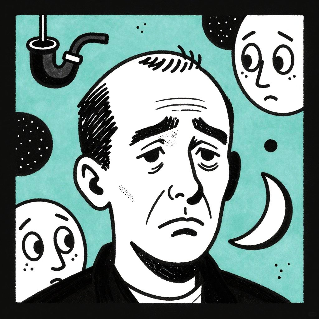 This is a black-and-white, hand-drawn illustration with a greenish-blue background. The central figure is a sad-looking, bald man with droopy eyes and a serious expression. He has a few lines on his forehead and a small mustache. Surrounding him are abstract objects like a pipe with smoke, a small black creature, and some circular shapes, creating a quirky, surreal atmosphere. The illustration has a textured, sketch-like quality.
