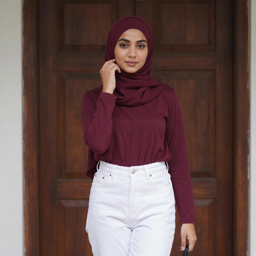 Photograph of a young woman with light brown skin and dark eyes, wearing a maroon hijab, long-sleeve maroon top, and white high-waisted jeans. She stands in front of a dark wooden door, touching her cheek with her right hand, and wearing black sandals.
