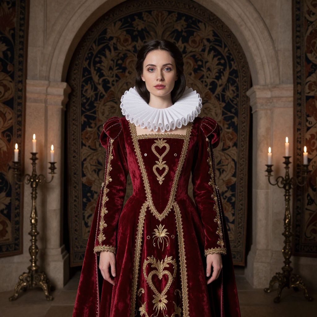 Photograph of a pale-skinned woman with dark hair in a Renaissance-style, deep red velvet dress with gold embroidery and a white ruffled collar,