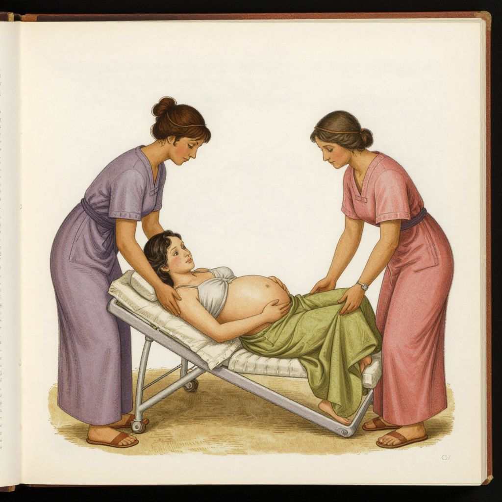 Illustration of two women in ancient-style dresses assisting a pregnant woman lying on a reclining chair, with a white background.