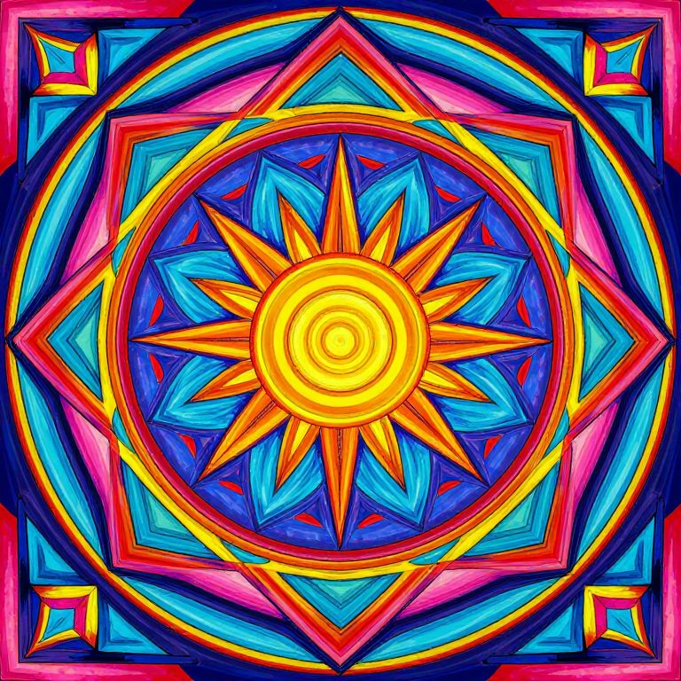 A vibrant, intricate mandala with a central sunburst, surrounded by colorful geometric patterns and vibrant hues.