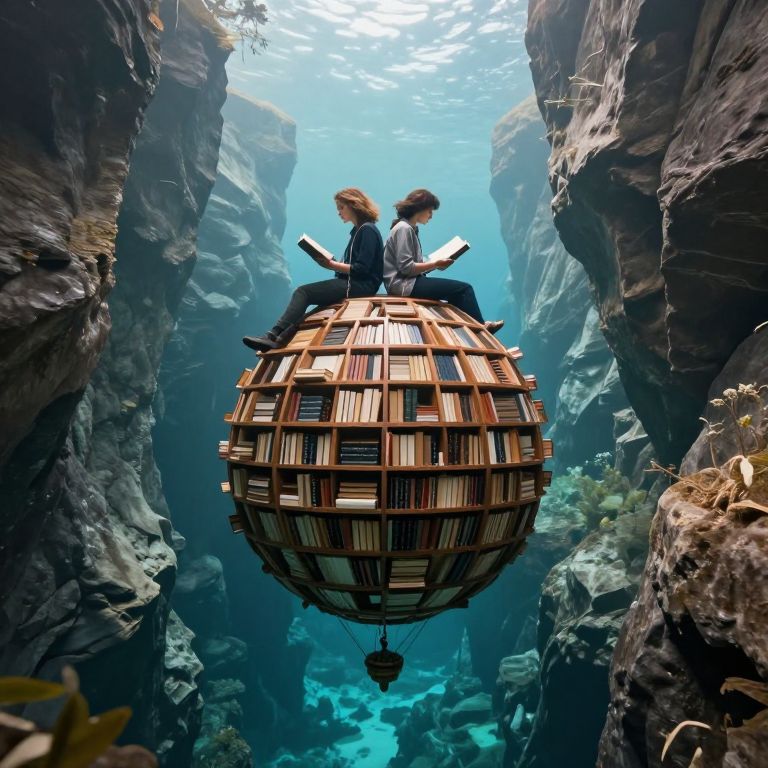 Two individuals perch atop a spherical structure filled with books, suspended between towering rock formations above a tranquil underwater canyon, as they read and explore the floating library.