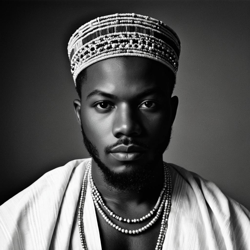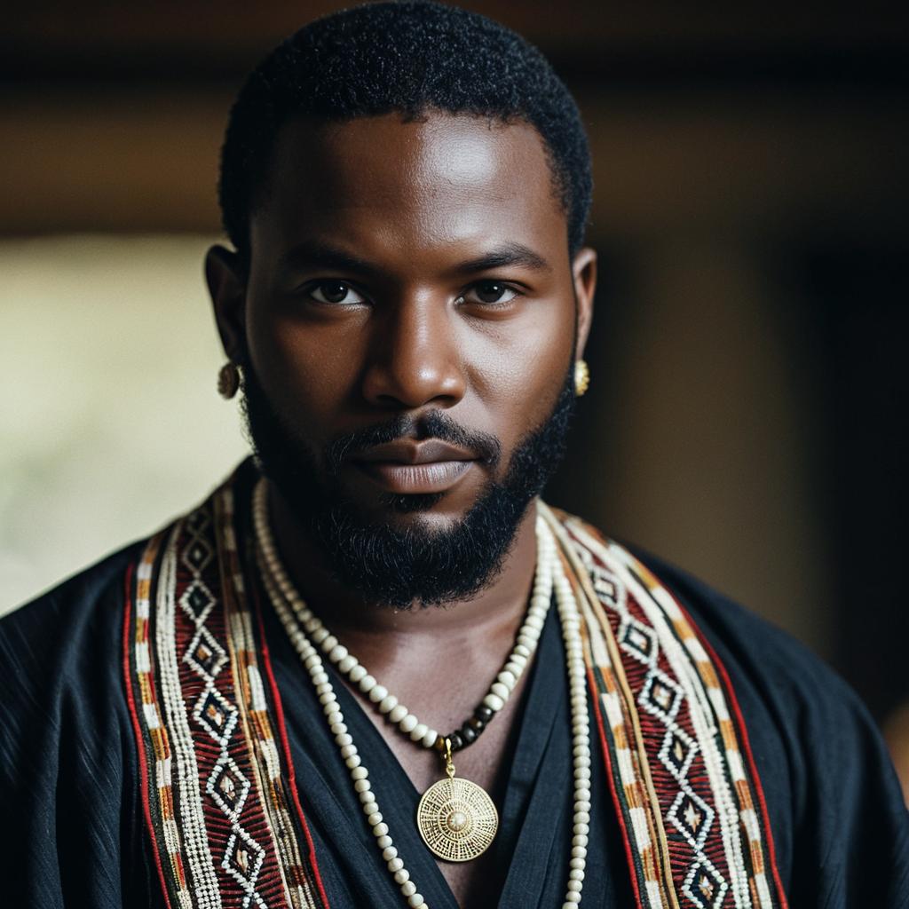 Igbo attire male,1boy, male focus, solo, watch, wristwatch, hat, realistic, facial hair, looking at viewer, beret, jewelry, beard, shirt, red headwear