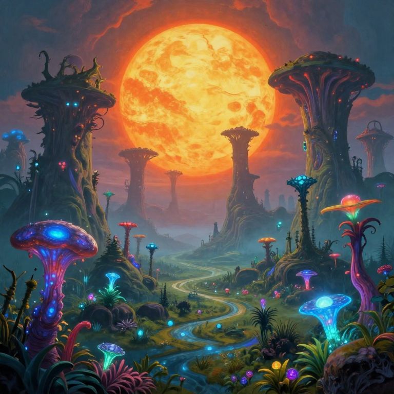 Fantastical digital artwork of a surreal forest under a glowing, orange full moon. Colorful glowing mushrooms and bioluminescent plants surround towering,