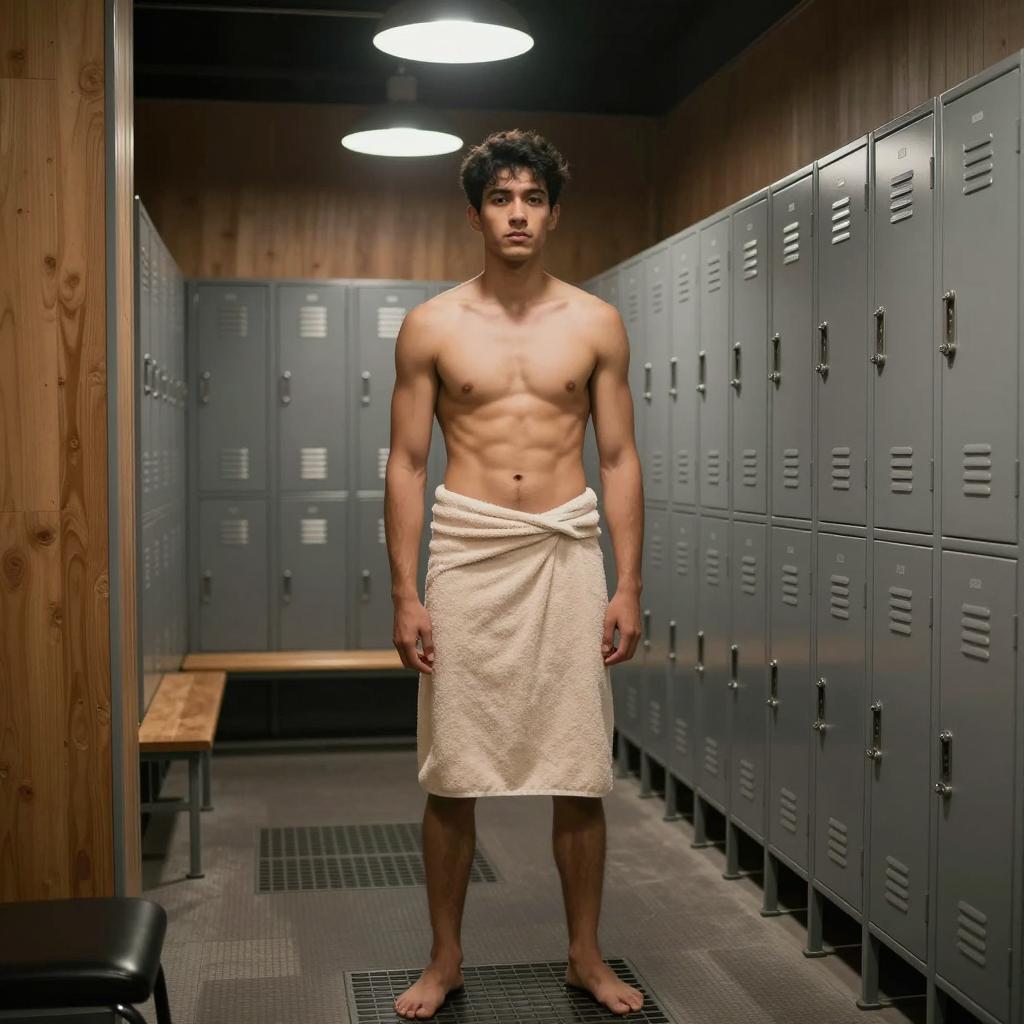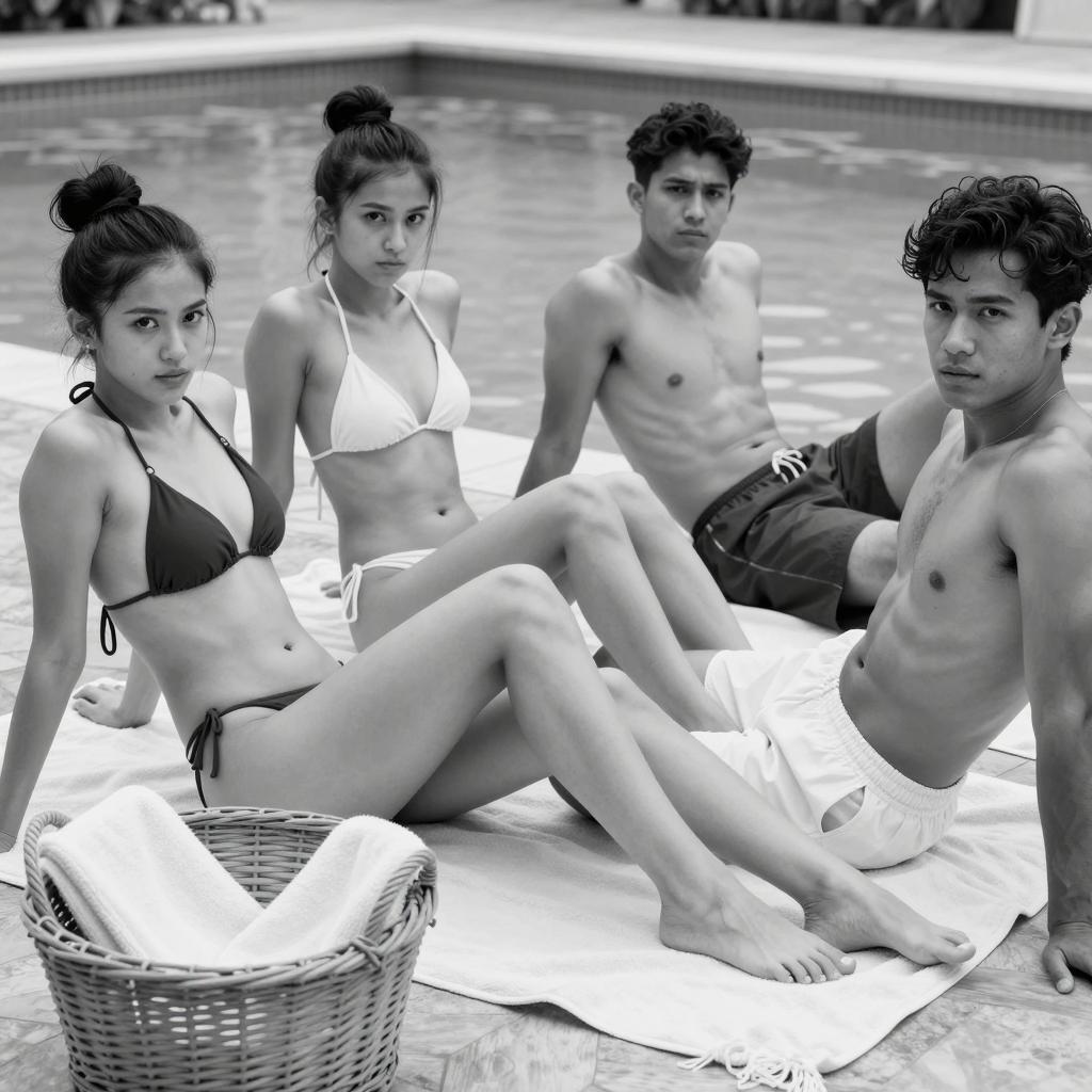 Photograph of four shirtless men standing closely together, leaning on a metal railing. Foreground man with short dark hair, hairy chest, neutral expression. Second man with dark curly hair, olive skin, intense gaze. Third man with short dark hair, slight smirk. Fourth man partially visible, dark hair, serious expression. Dark, dimly lit background.