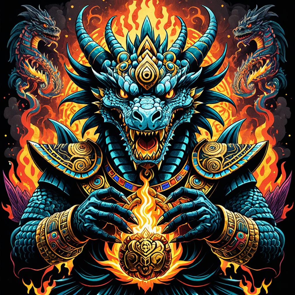 Anime-style illustration of a fierce blue dragon adorned with Aztec-inspired golden armor and heavy metal embroidery. The dragon holds a glowing molten gold orb with flames, set against a psychedelic smoky background with distorted dragon characters and a clowncore aesthetic.