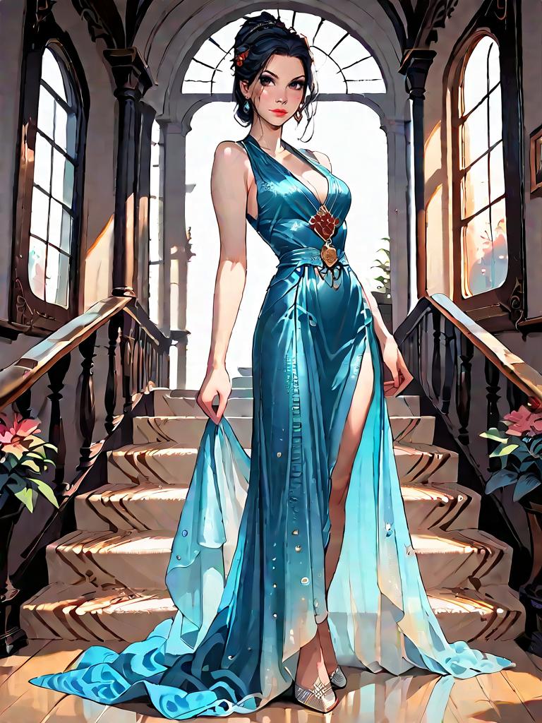 Digital art of a beautiful woman with dark hair in an elegant, blue, sleeveless gown with a high slit, standing on sunlit stairs in a