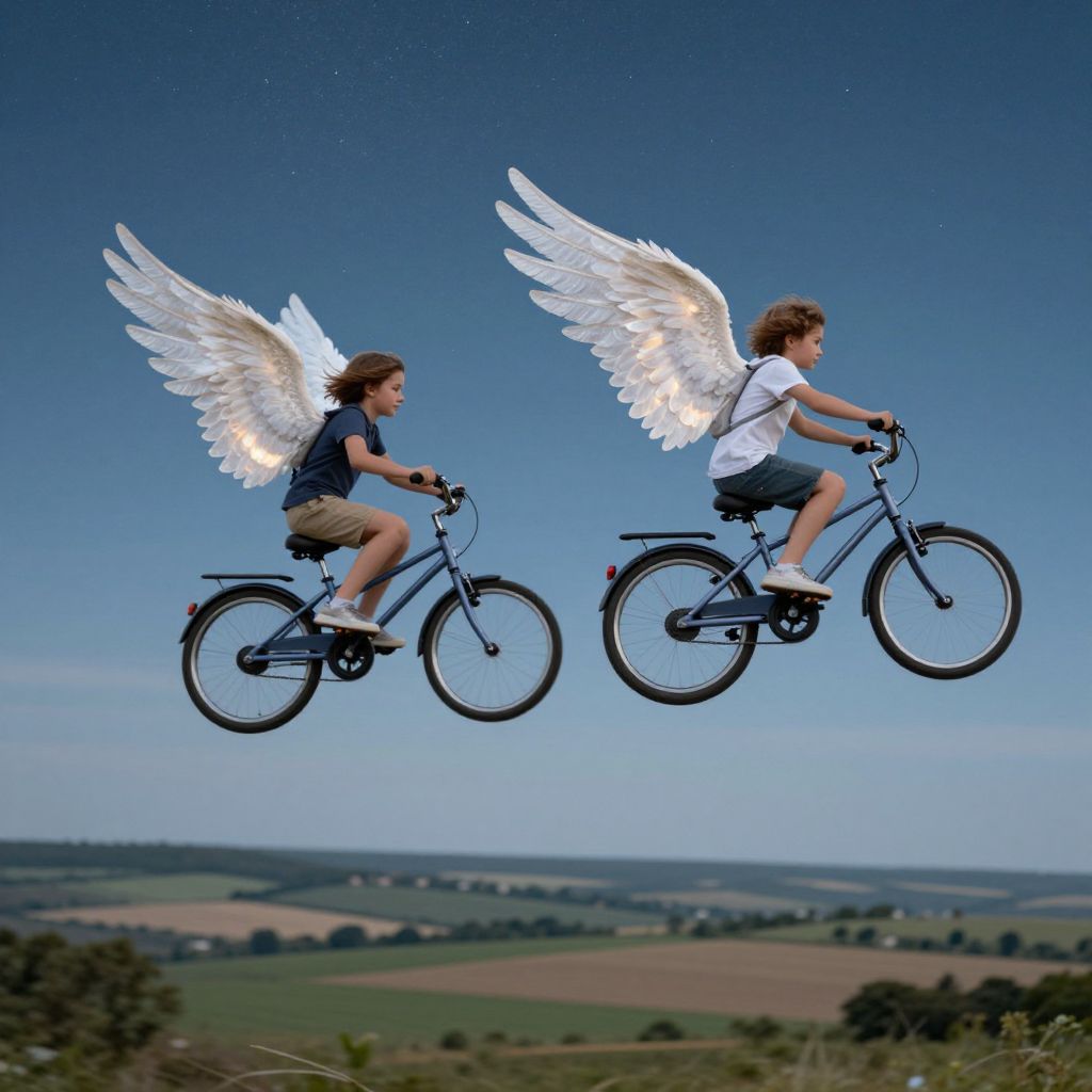 A child with golden wings gracefully pedals a rust-colored bicycle through a starlit sky, surrounded by fluffy clouds and twinkling stars, embodying the magic of childhood dreams and imagination.