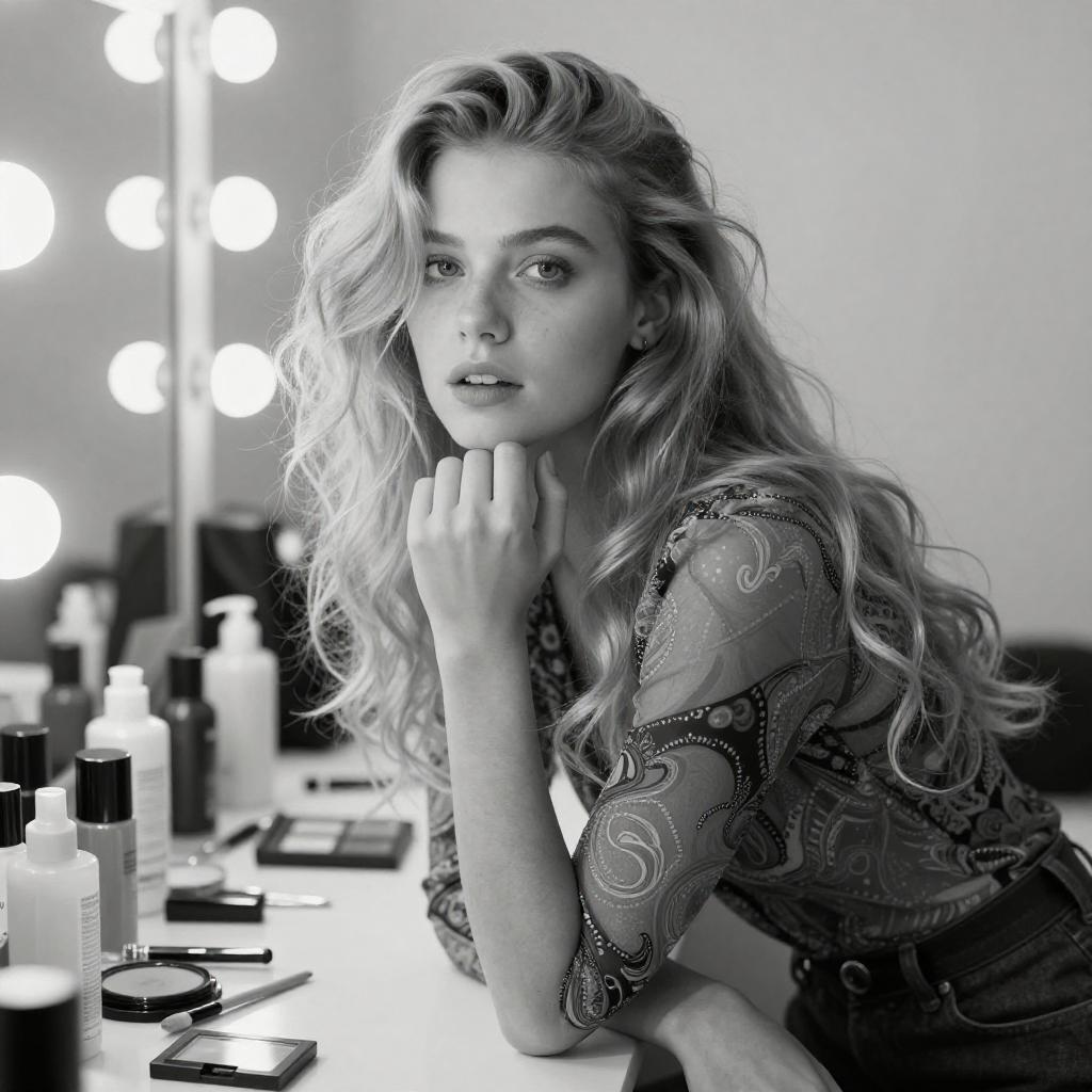 Black-and-white photograph of a young woman with long, wavy blonde hair, wearing a sheer, patterned top, leaning on a makeup counter. Her right hand touches her chin, and she gazes directly at the camera with a slightly open mouth. Makeup bottles and lights are blurred in the background.