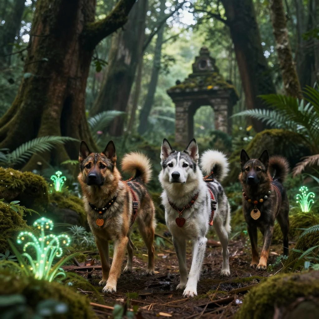 Humanoid dogs exploring an ancient forest, lush greenery with magical glowing plants, tribal clothing and accessories, mystical atmosphere, intricate fur patterns