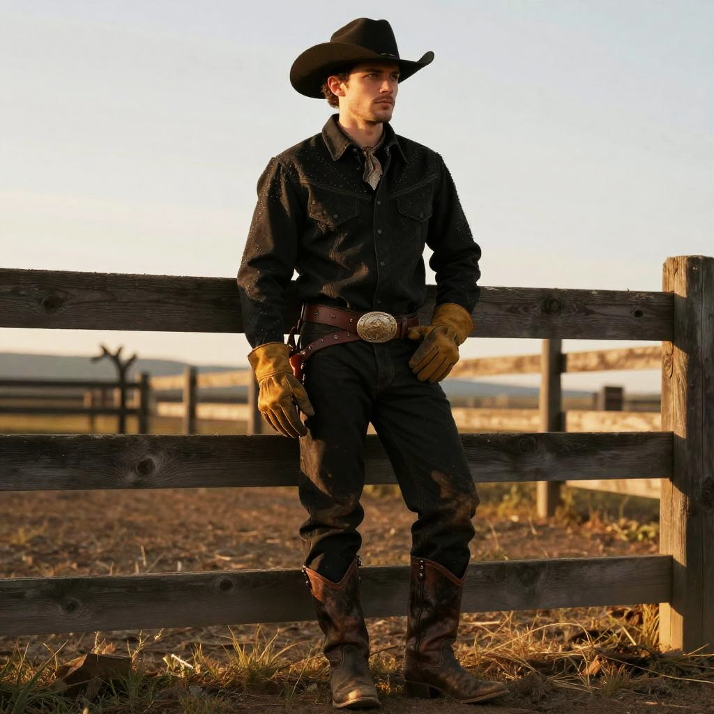 Cowboy outfit black, vintage wild west look, worn-in boots and gloves, standing by a wooden fence, golden hour light, textured fabric details, highly detailed portrait
