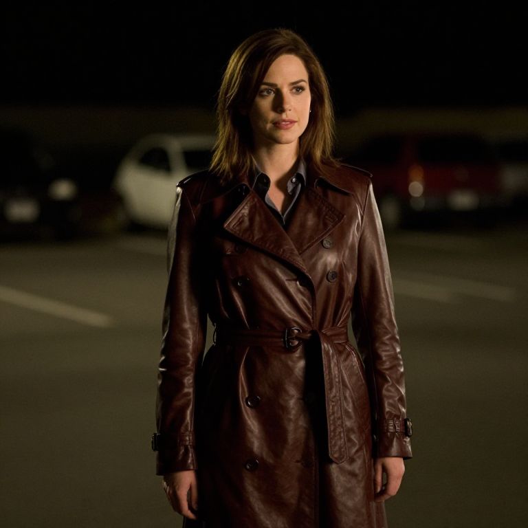 Deliberate film still from a 2005 movie, Lauren Graham wearing a leather trenchcoat, standing at a parking lot, night,