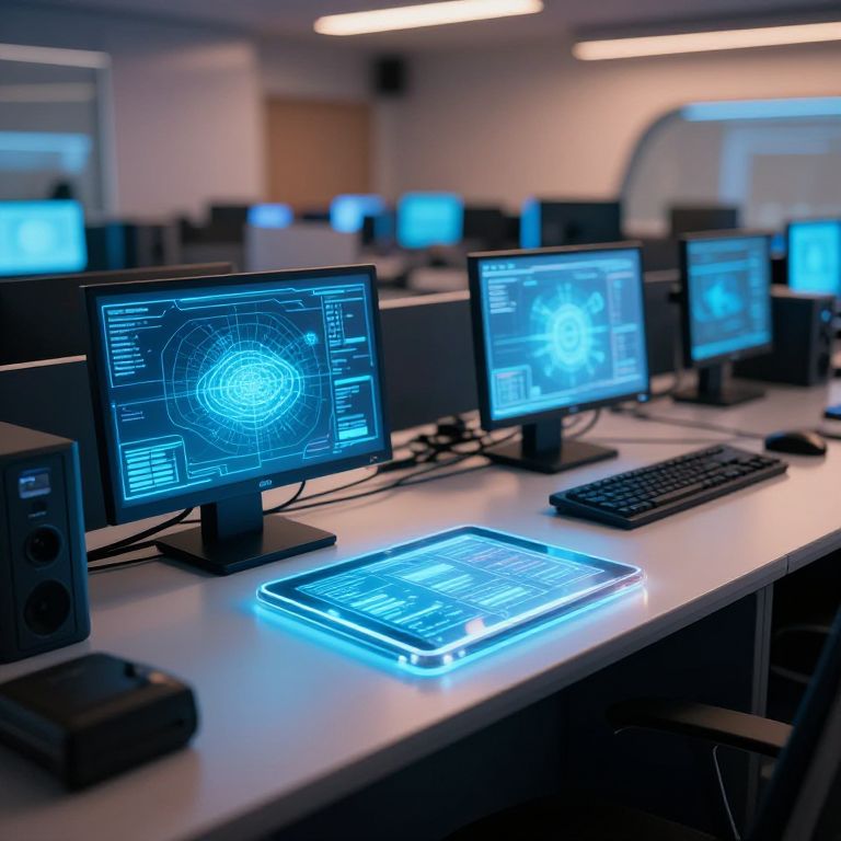 A futuristic computer lab with rows of advanced workstations, glowing screens, and a transparent tablet, set against a backdrop of soft, ambient lighting and high-tech equipment.