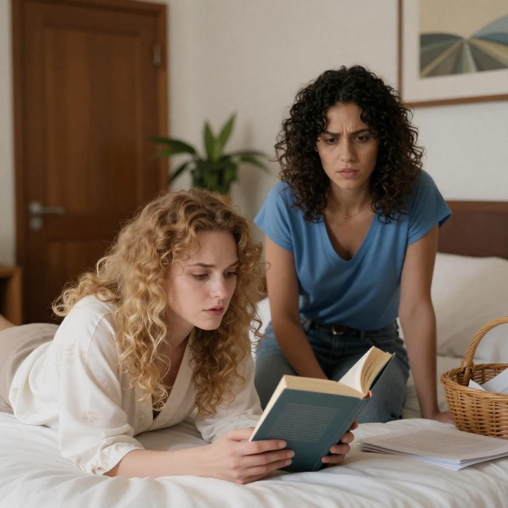 Two women with curly hair in a bedroom, one with blonde hair wearing a white patterned robe lying on her stomach on a bed holding a book, the other with dark curly hair in a blue top and jeans sitting beside her. The room features a wooden door, a plant, framed artwork, a wicker basket, and scattered papers on the bed. Both women have intense, focused expressions.