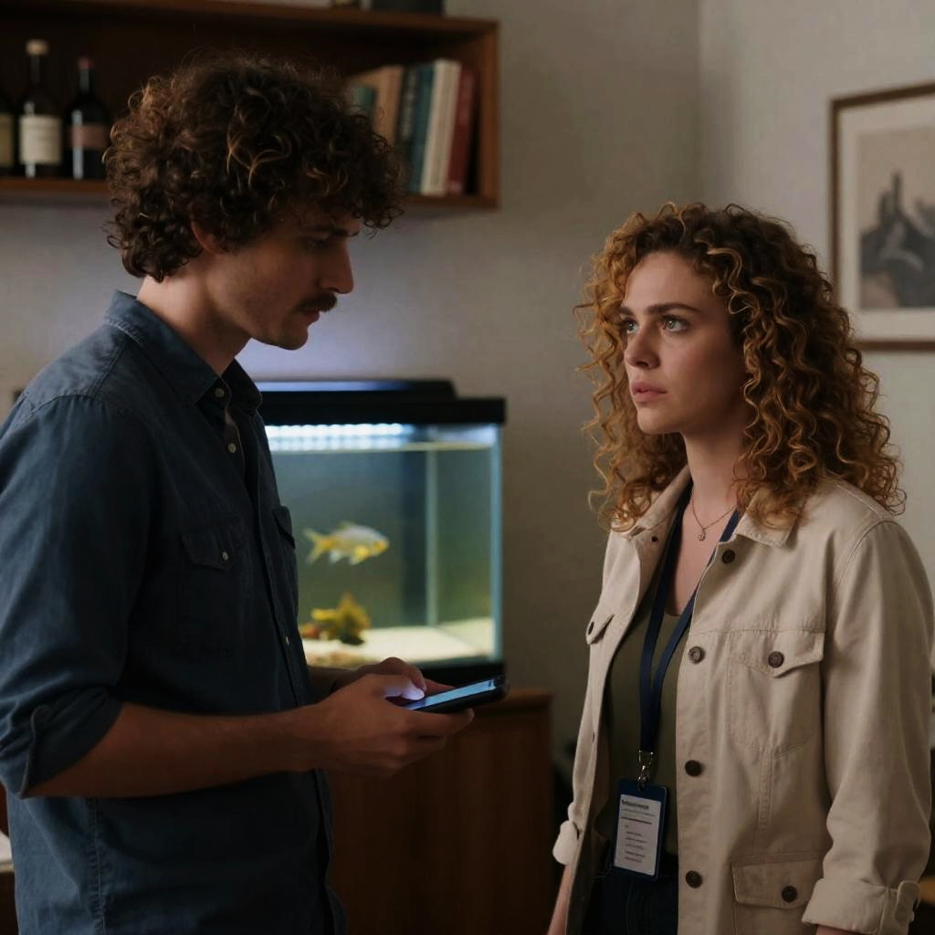 Two women on a bed, one with curly blonde hair in a white patterned robe, the other with curly dark hair in a blue top, holding a book. The blonde woman lies on her stomach, the brunette stands beside her. Background includes a wooden door, plant, and framed artwork. Basket and papers on the bed. Intense expressions on both women's faces.
