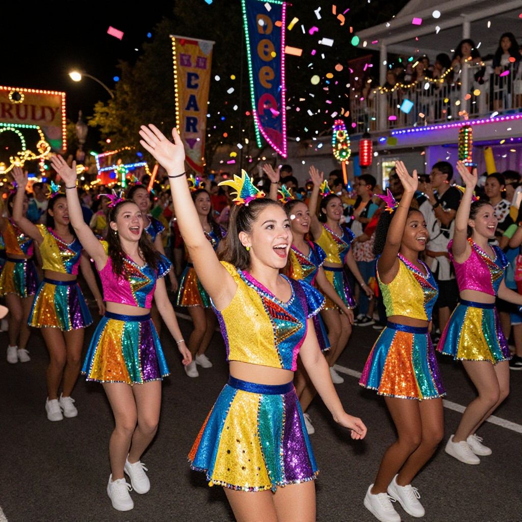 Photograph of a vibrant parade with smiling female dancers in colorful sequined uniforms, raising arms, confetti falling, and a crowd cheering in the background