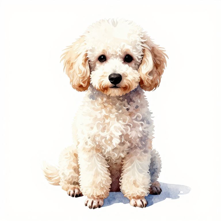 The image depicts a watercolor-style illustration of a white poodle puppy. The puppy is sitting with its front paws extended in front of it, facing the viewer. Its fur is depicted with a mix of white and light brown hues, giving it a fluffy and textured appearance. The background is a plain white canvas, which contrasts with the vibrant colors of the puppy. The watercolor effect is evident in the way the colors blend and overlap, creating a soft and natural look. The puppy's ears are long and hang down, adding to its adorable and playful expression. The overall composition is simple yet effective, with the puppy being the central focus of the image. The use of watercolors adds a sense of movement and fluidity to the illustration, making it appear lively and dynamic.