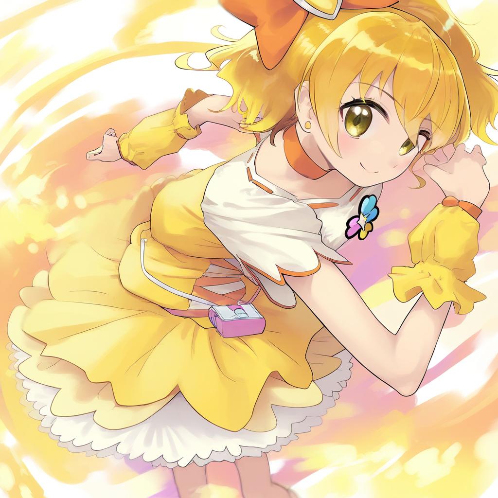 Digital illustration of a magical girl with blonde hair styled in a short ponytail, wearing a yellow and white dress with orange and yellow accents. She has large yellow eyes, an orange choker, wrist cuffs, and a heart-shaped hair ornament with a large yellow bow. The character is depicted in a dynamic floating pose, set against a soft, pastel-colored background with swirls of yellow and pink.