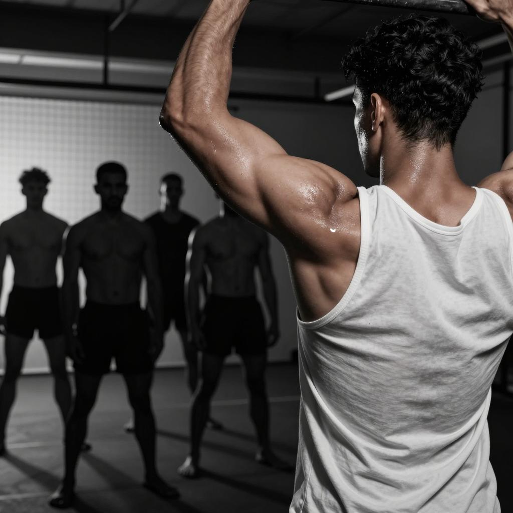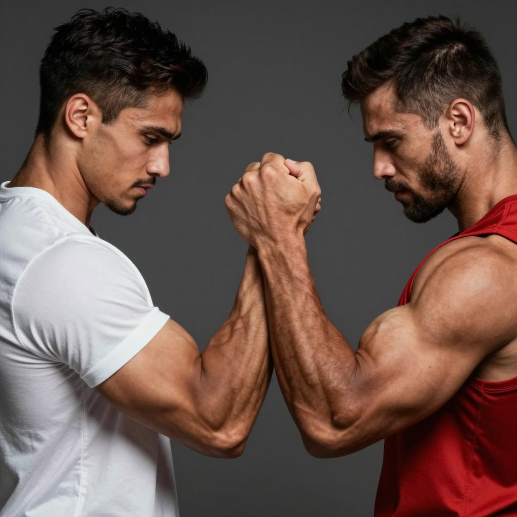 Muscular man with short dark hair, wearing red boxing gloves and a wrapped arm, raises his right arm. Red ured background. Side profile, intense expression, focused gaze. Right arm is prominently wrapped. Boxing theme.