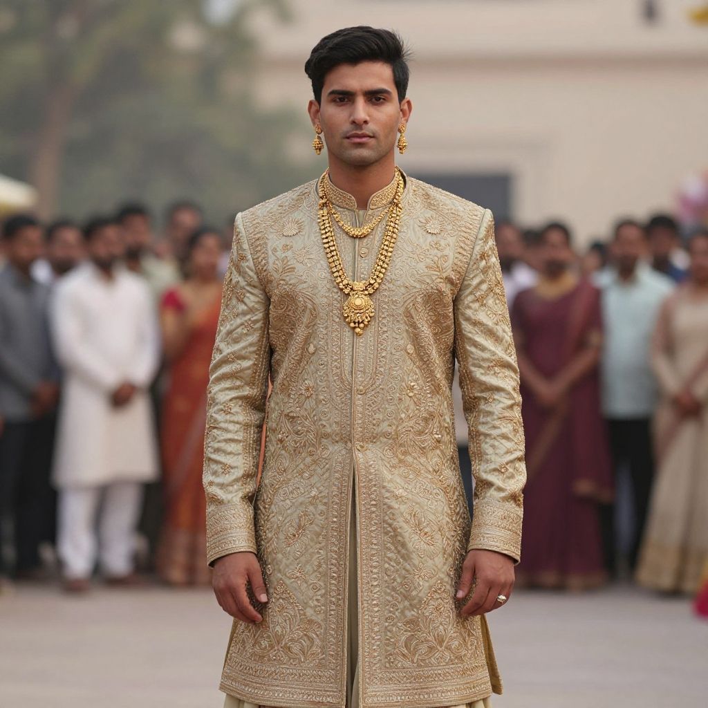 A young man is dressed in an ornate traditional lehenga coat costume featuring intricate gold embroidery and detailed patterns. He accessorizes with matching gold jewelry, including necklaces and earrings, standing confidently outdoors with a blurred crowd in the background.