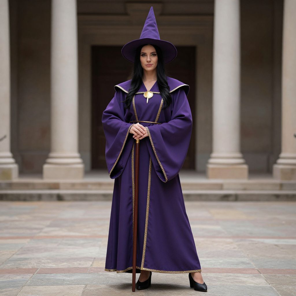 Sorcerer Costume Female, woman in a purple robe and hat posing for a picture