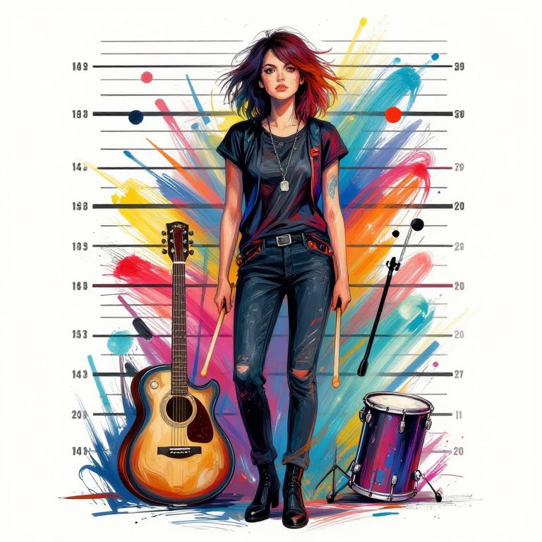 A creative interpretation of Meg White height through an abstract height chart featuring musical instruments and drumsticks, stylized with vibrant colors and dynamic brush strokes, blending rock and indie music elements in a contemporary art style.