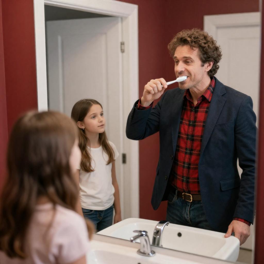 Middle-aged man with curly brown hair, red plaid shirt, and navy blazer brushing teeth in front of mirror. Young girl with long brown hair, white shirt, standing in doorway, watching. Red curtains on sides, toiletry items on sink.